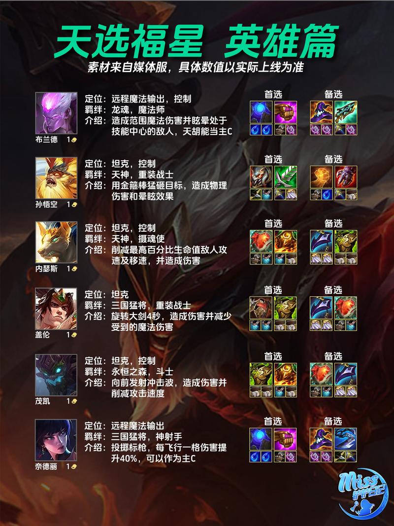 〖Two〗、天选之人特别之处在于,他们携带的羁绊职业或特质,在计算羁绊效果时,会被视为拥有两个相同的羁绊。此外,所有天选之人还额外获得了200的生命值加成。除此之外,他们还具有以下一种额外的特殊属性加成:300的生命值、15%的法术强度、15的攻击力,或是减少15%的法力上限。
