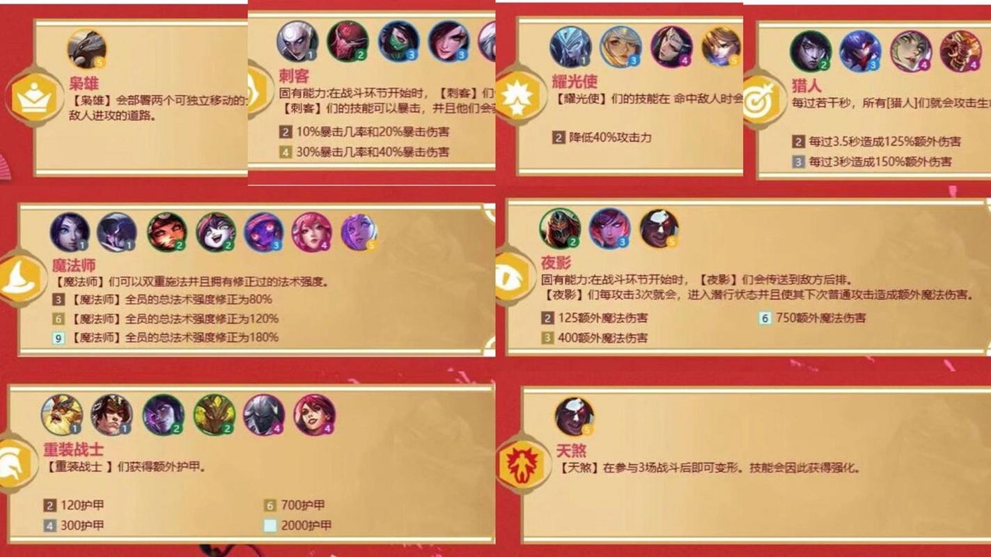 宗师 在战斗开始时,宗师会降低敌方50%的攻击速度,持续3秒。 重装战士 重装战士们获得额外护甲,2级提供100护甲,4级提供200护甲,6级提供500护甲。 月神 将星级最低的月神英雄增加1星,如果星级相同,则选取装备比较多的。3个月神英雄提升1星,5个月神英雄提升2星。