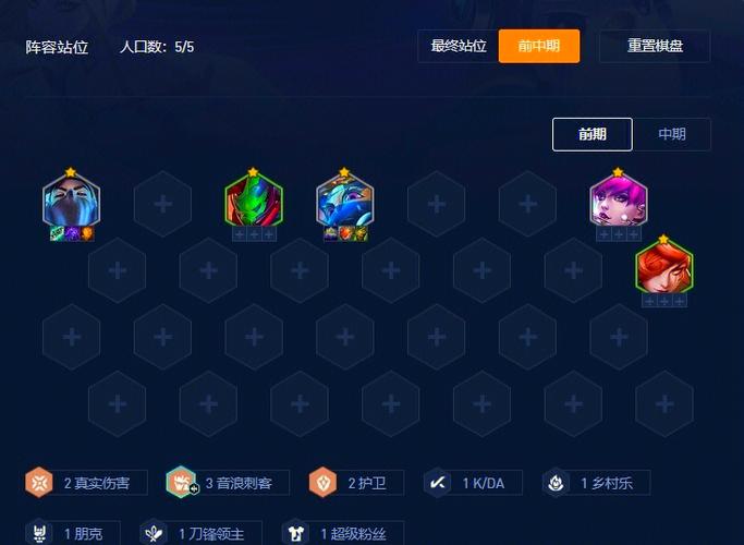 〖One〗、前期过渡策略: 第一种:直接奔向最终阵容,从2阶段自然刷出音浪卡特开始构建。 第二种:2阶段纯连败,优先收集莉莉娅、伊芙琳、凯南、卡特琳娜,并确保这些角色达到2星,保持利息,利用打野怪时临时抓取1费天选。