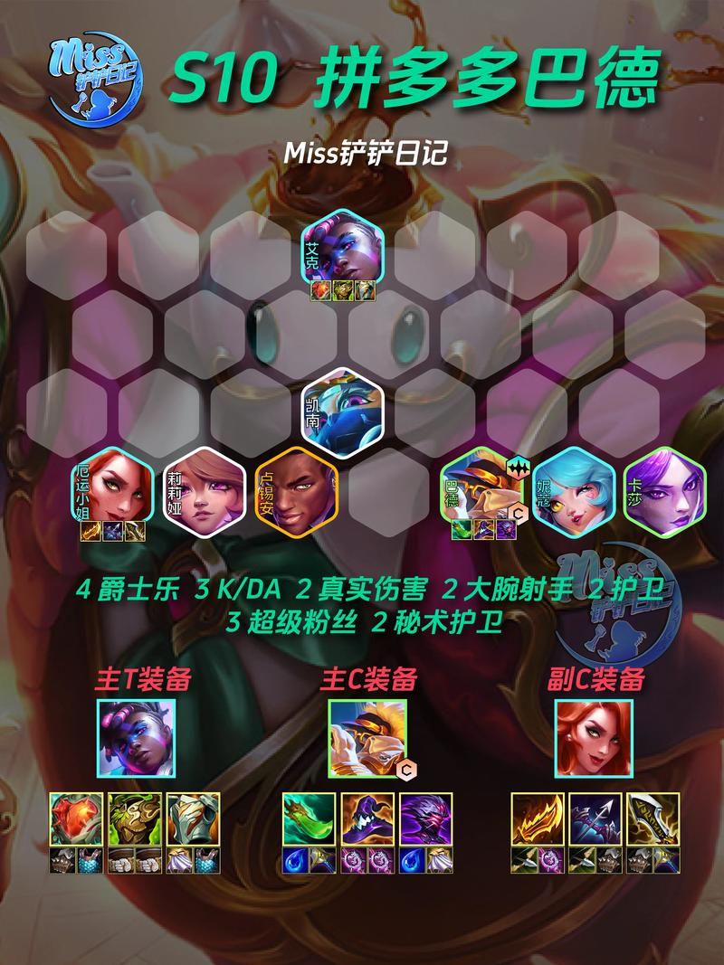 福星阵容组成与羁绊解读,剑魔『4』、塔姆『1』、猪妹『4』、安妮『2』、派克『2』、萝莉『3』、烬『4』、卡特『3』。开局选取塔姆带福星装备,福星版本下,装备选取卡特琳娜优先续航装备,如科技枪或正义,科技枪能为队友提供恢复,正义则提升蓝量,以便提前释放技能。