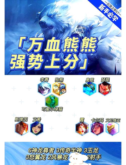 装备选取: 核心装备:狗熊作为主C时,羊刀和火炮是必备装备。羊刀提供攻速加成,使狗熊的攻击频率逐渐增加;火炮则增加攻击距离,避免近战时被集火,同时利用攻速优势进行远程输出。 阵容搭配: 狗熊通常出现在神龙尊者阵容中,但并非主流主C。