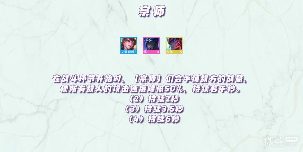 宗师 效果:在战斗开始时,宗师会降低敌人50%攻击速度.『2』 持续3秒 『3』 持续5秒 『4』 持续8秒 重装战士 效果:重装战士们获得额外护甲。『2』 100护甲 『4』 200护甲 『6』 500护甲 月神 效果:把星级最低的月神英雄增加1星,如果等级一样那么就选装备比较多的。