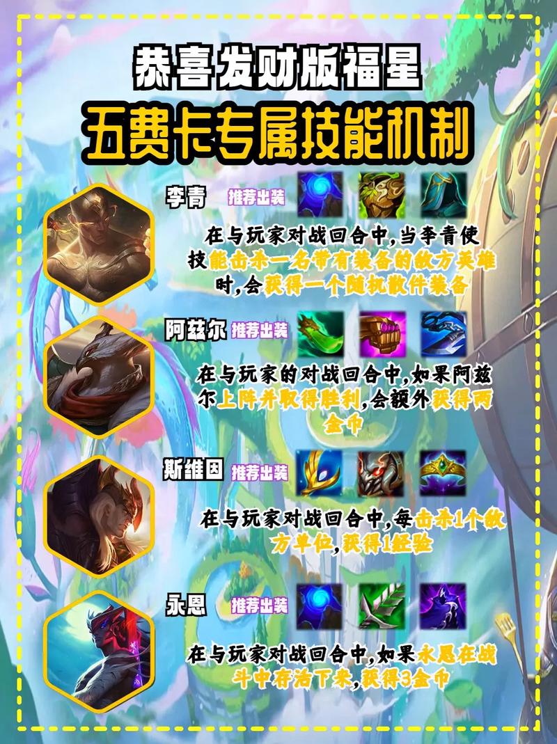 时空裂痕:7神将2骑士,保护好后排即可稳定吃鸡。双城之战:6黑魔3帝国,成型后乌鸦近乎无敌;6学院2挑战2保镖,永恩不被秒即无敌。福星临门:8三国猛将2刺客,胜利后增加伤害,无天敌;6魔法师3永恒之森,击杀敌人后增加法强。