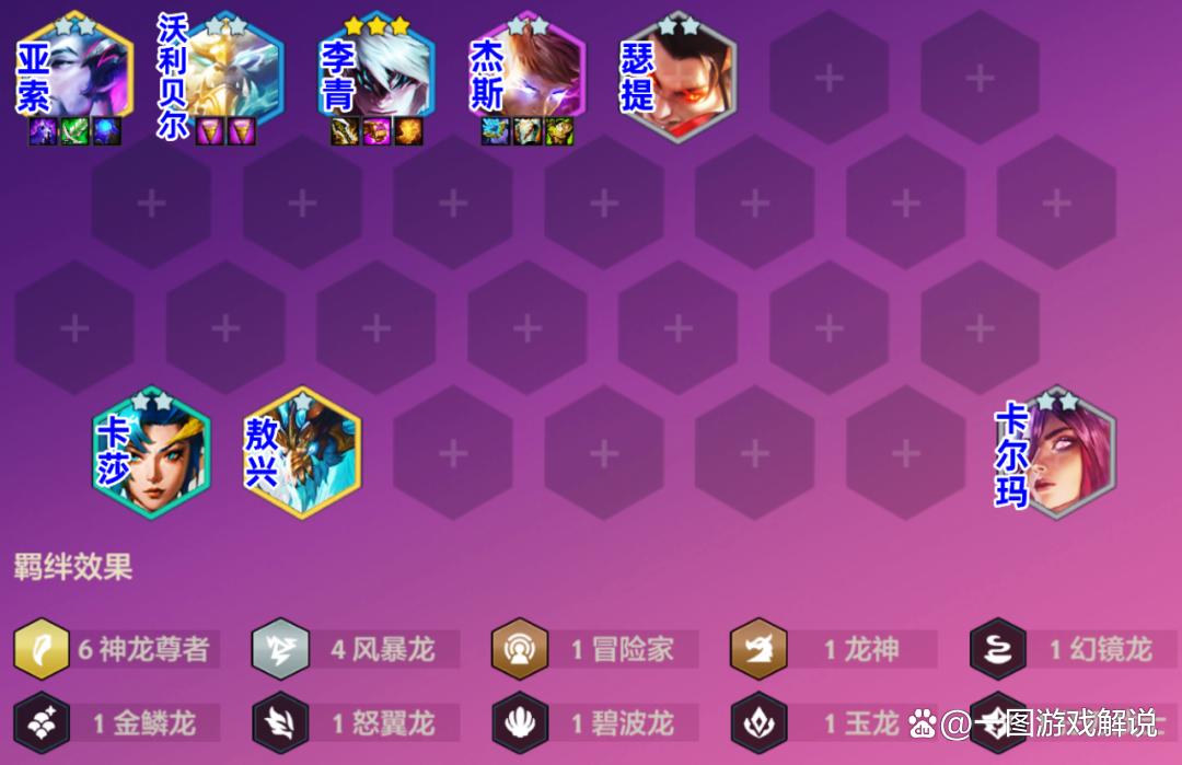 〖Four〗、开局有风暴之眼、公理圆弧海克斯这套阵容强度会质变;6神龙下的李青能快速打出巨额伤害,敖兴补出4风暴的同时收割残局。这套阵容6-8人口过渡平滑且3-4阶段强度够高,适合新手选取。装备 运营 2-1升四人口,用2护卫+2风暴龙过渡。2星护卫吃风暴格。神龙尊者卡全留。