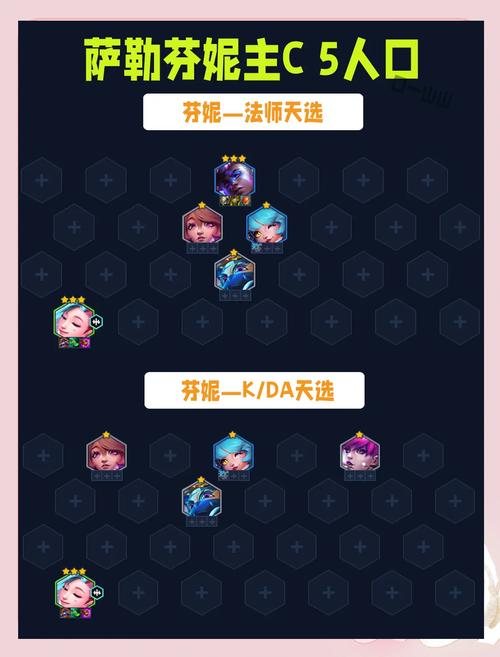 〖Four〗、金铲铲之战KDA法师萨勒芬妮阵容推荐早期过渡成员:萨勒芬妮+古拉加斯+安妮+伊芙琳+莉莉娅阵容解析羁绊选取:3K/DA+3法师该羁绊可帮助此阵容快速稳定血量,以免在核心C位成型之前被带走。该阵容属于低费卡,很好凑齐,难度较低。