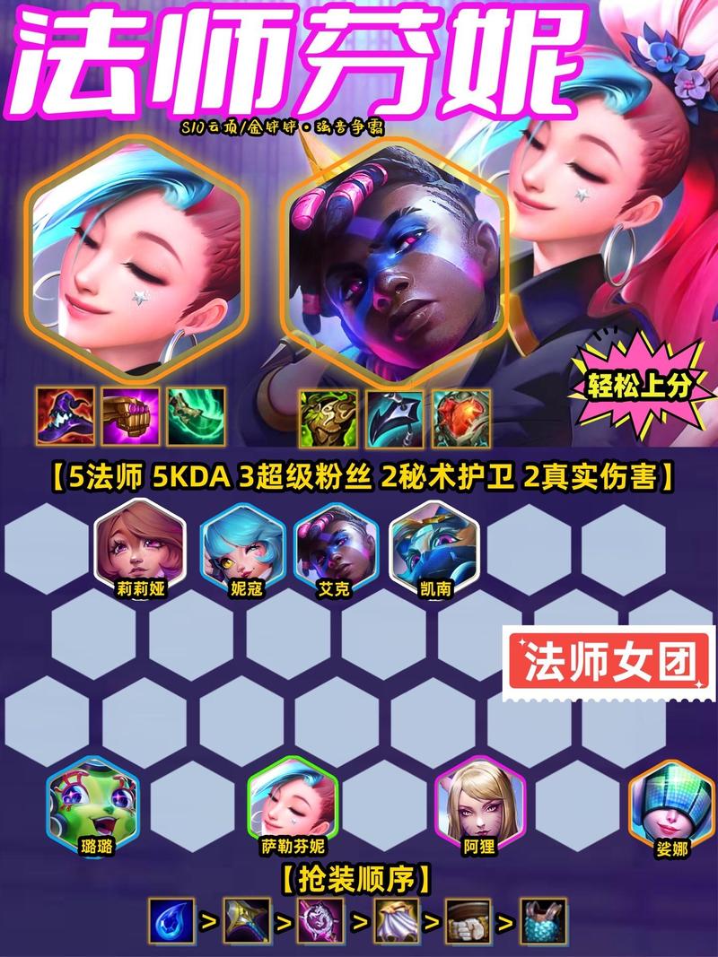 〖Two〗、同时,利用莉莉娅与妮蔻搭配凯南的3超级粉丝+2护卫羁绊,进一步增强阵容的续航能力,而萨勒芬妮的赛季之星还能免费获得灭世者的死亡之帽,装备成型更为容易。5法师羁绊能增加全员法强,特别是低法力值的棋子如璐璐、阿狸、萨勒芬妮,技能释放频繁,法强收益更高。