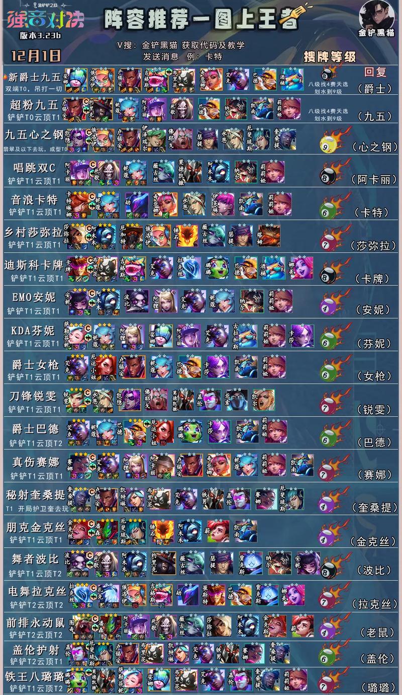 〖One〗、金铲铲之战“音浪卡特”阵容推荐如下:阵容组成: 核心英雄:卡特琳娜 其他成员:劫、妮蔻、奇亚娜、永恩、伊芙琳、凯南、莉莉娅 羁绊搭配: 6音浪刺客:提升刺客们的攻击速度和暴击伤害。 3KDA:提供额外的攻击力和法术强度。 3超级粉丝:为友军提供治疗效果。 2真实伤害:造成无视护甲和魔抗的真实伤害。