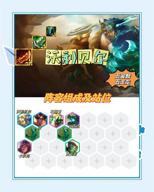 阵容站位:沃利贝尔需站在对面后排C位的同边,奥恩则位于对面C位对角,其他英雄根据情况调整站位,以达到最佳效果。 阵容站位调整:玩家需根据对方站位随时调整换边,以充分发挥阵容威力。 三星优先:沃利贝尔必须三星,七人口时可追三星沃利贝尔并留凤凰的牌。经济条件允许时,也可追三星。