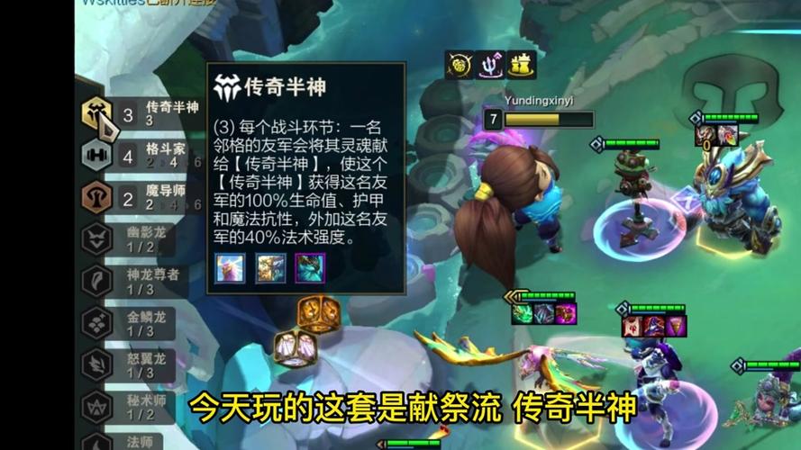 在金铲铲之战S7赛季巨龙之巢15版本中,传奇半神羁绊将献祭队友。每当战斗环节开始时,相邻格子中的友方弈子会将其灵魂献祭给传奇半神弈子。献祭后,传奇半神弈子将获得被献祭弈子的全部生命值、护甲、魔抗以及额外30%的法强。