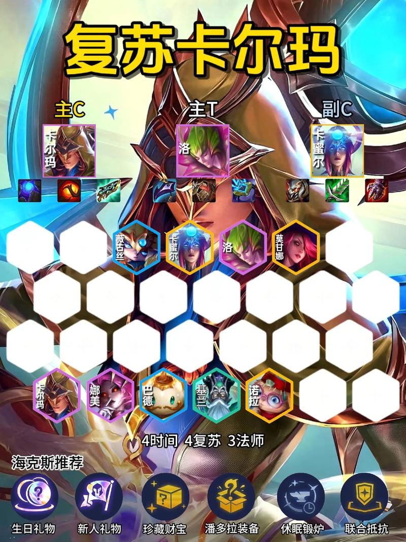 〖Three〗、核心装备:主c诺姆希 青龙刀、无尽、法爆。最优三件套 后两件可以被其他法系输出装替代主t塞拉斯 传送门、板甲、狂徒等防御装备副c拉克丝 给到剩余的法系输出装备。强化符文:优选:珠光莲花、阿福的百宝袋、法师羁绊类、公里圆弧备选:回复类、经济类、装备类都可以。运营过渡:前期用星界斗法过渡。