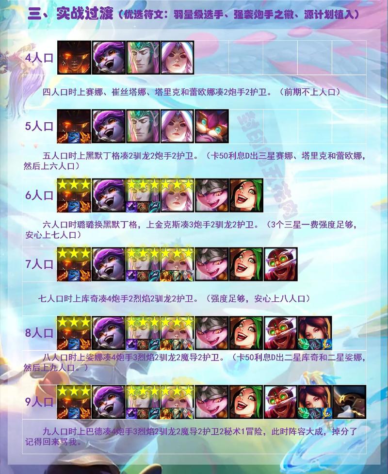〖One〗、阶段比较无脑,就是3变异靠着蚂蚱虫子强势猛冲就行了 3-2上6人口,如果连胜的好没有蚂蚱虫子,可以小D个10块钱看看能不能拿到,多了还没蚂蚱就别花了,趁早转阵容吧,S6讲究的就是看条件看天胡才能稳定吃分,不是固定一个思路无脑冲的赛季了,硬说比较无脑的还是斗*和狙神。