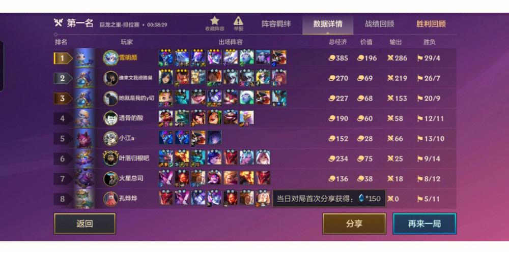 〖Two〗、金闪闪的快乐:单人排位模式上阵至少一名3星橙卡并且获得第一名。(紫色成就)多多益善:匹配/排位模式至少10人口并且获得第一名。(紫色成就)预留了容错但没用上:排位模式130点的血量获得第一名。(紫色成就)满血第一:排位模式100点的血量获得第一名。