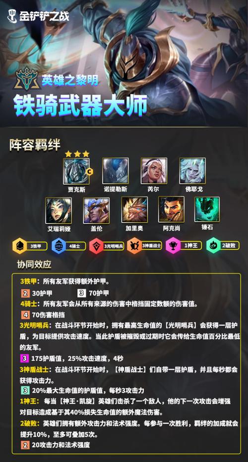〖Four〗、阵容组成包括锤石、刀妹、泰坦、武器、芮尔、加里奥、佛耶戈、盖伦和阿克尚/洛(9人口)。阵容羁绊为3铁甲4骑士1神王2破败3光明3神盾。转职选取方面,推荐铁甲转职,特别是在对抗小恶魔阵容时更为有效。刀妹可以选取重骑转职,以达到极致减伤的效果。