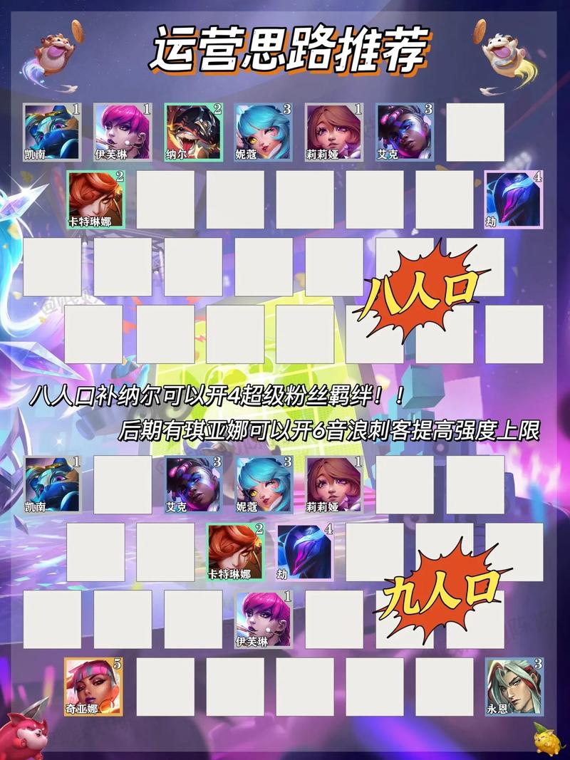 〖One〗、卡特琳娜、劫、妮蔻、奇亚娜、永恩、伊芙琳、凯南、莉莉娅。羁绊组成:6音浪刺客、3KDA、3超级粉丝、2真实伤害、2护卫。赛季之星:卡特琳娜-音浪刺客。符文强化:理想配置为2个正义之手,通过顶级提升组建大军,7回合给2个小妮蔻,帮助快速达到3星。装备自助餐可以在石头人结束后,让卡特神装。