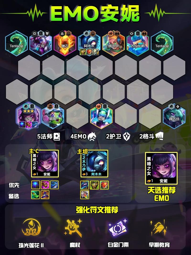 〖Four〗、金铲铲之战最强阵容魔法师弹弹乐阵容搭配攻略【阵容推荐】【装备推荐】优先给维迦(小法)拿蓝霸符,然后给安妮拿狂徒铠甲,前中期血量比双抗重要,可以保证不掉很多血,安稳渡过前期。
