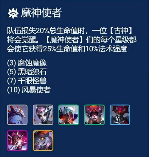 腥红之月:这个羁绊与加里奥有关,不同数量的腥红之月单位可以召唤不同形态的加里奥,从暴君到魔王再到至尊魔神,实力逐渐增强。天神:在攻击一定次数或生命值跌到一定比例后,天神会飞升,获得伤害减免和额外真实伤害。神射手:攻击和技能会弹射到附近的敌人。永恒之森:永恒之森英雄们会成长,获得额外属性。