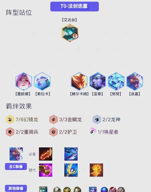 在金铲铲之战S7赛季中,幻境龙的玩法推荐阵容被称为幻镜龙迭嘉,它由六名幻镜龙、四名重骑兵、一名龙神、两名狂刃战士和一名冒险家组成。强化符文的最佳选取包括幻像、代谢增速器和珠光莲花,备选符文有复苏之风、重骑兵之徽和幻镜龙之徽。