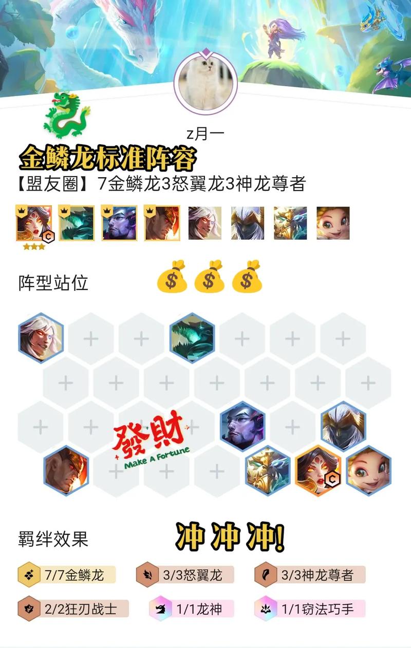 《金铲铲之战》金鳞龙刺客阵容推荐配置:男刀、艾达丝、凯隐、皎月、锤石、派克、佐伊首先金鳞龙神艾达丝是坦度比较高的龙神没有之一,技能还能保护队友输出,大部分对局都是队友全死完了他还坚挺着。其次5金鳞龙羁绊会额外获得2件金鳞龙专属装备,非金鳞龙单位也可以佩戴,可以养多个C位。