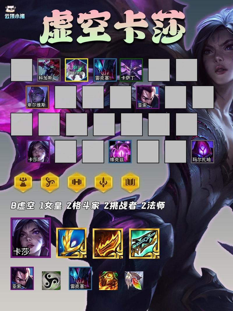 〖Two〗、卡莎在金铲铲之战S9赛季是一张4费卡,不仅适用于虚空阵容,还可以融入多种组合。 在游戏早期,即2-1阶段升至4级,2-5阶段升至5级,3-2阶段升至6级,4-1或4-2阶段升至7级,确保阵容中有强大的棋子和羁绊支持。