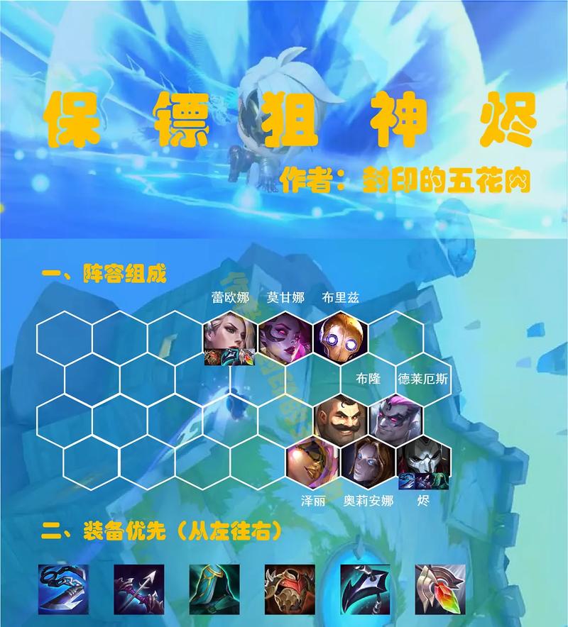 〖Two〗、阵容搭配:奥莉安娜、烬、杰斯、迦娜、基兰、凯特琳、卡蜜尔、萨勒芬妮。 羁绊搭配:未来守护者、4精密发条、2执法官、社交名流、2白魔法师、3发明家、2狙神。 海克斯搭配:主选:狙神之魂、狙神之心、赏金猎人之心;次选:狩猎律动海盗风范、星界赐福1。