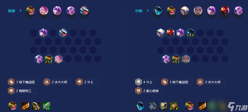 黑客阵容为运营流,前期用源计划格斗过渡,劫的装备优先给艾希打工,中期可用薇恩过渡,后期有劫则直接替换阵容。开局装备:巨人腰带、反曲之弓,装备优先做前排肉装,确保过渡期的稳固。2阶段:2-1拉4人口,2-5拉5人口,前期拿3源计划2格斗羁绊打工。若拥有薇恩,直接上薇恩过渡。肉装在前期至关重要。