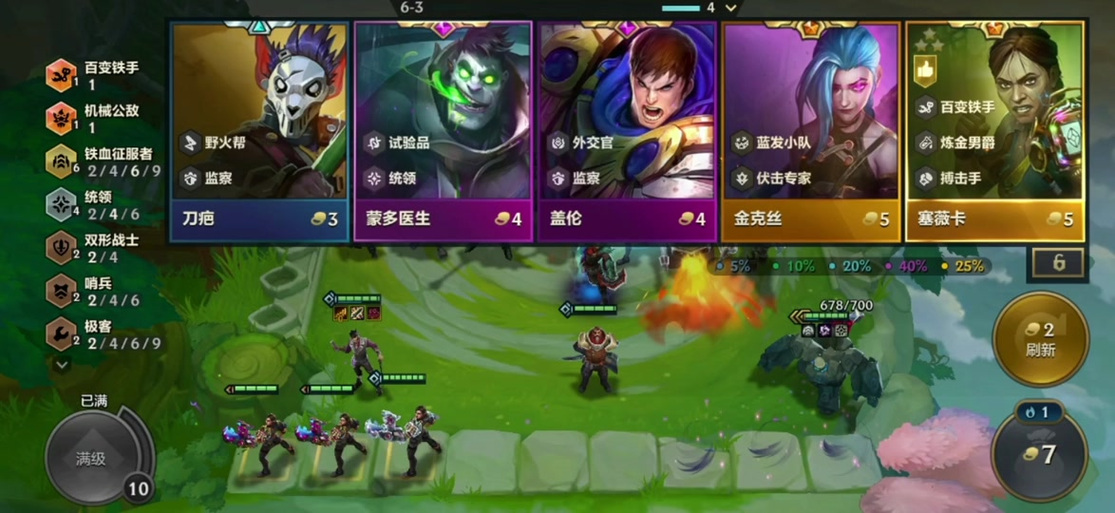 首先,我们来看看阵容搭配。阵容包括蒙多、厄加特、金克丝、蔚、扎克、风女、杰斯、塔姆和猫咪。通过组合,我们构建了2姐妹、1食神、1猫猫、1未来守护者、4格斗家、3炼金科技、2执法官、2极客、2学者和2枪手的羁绊。