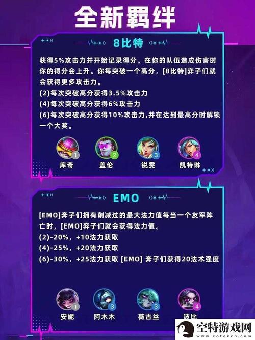 腥红之月:这个羁绊与加里奥有关,不同数量的腥红之月单位可以召唤不同形态的加里奥,从暴君到魔王再到至尊魔神,实力逐渐增强。天神:在攻击一定次数或生命值跌到一定比例后,天神会飞升,获得伤害减免和额外真实伤害。神射手:攻击和技能会弹射到附近的敌人。永恒之森:永恒之森英雄们会成长,获得额外属性。