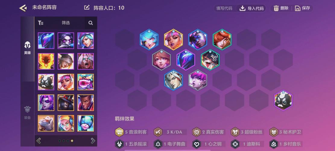 〖Two〗、卡特琳娜、劫、妮蔻、奇亚娜、永恩、伊芙琳、凯南、莉莉娅。羁绊组成:6音浪刺客、3KDA、3超级粉丝、2真实伤害、2护卫。赛季之星:卡特琳娜-音浪刺客。符文强化:理想配置为2个正义之手,通过顶级提升组建大军,7回合给2个小妮蔻,帮助快速达到3星。装备自助餐可以在石头人结束后,让卡特神装。