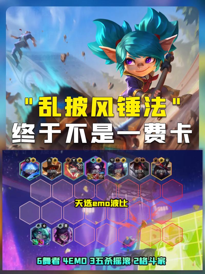 〖Four〗、金铲铲之战EMO舞者波比阵容攻略 阵容构成:贾克斯、波比、阿木木、约里克、瑟提、纳尔、卡尔萨斯、安妮、薇古丝。站位如下图所示:羁绊效果:6舞者4EMO3五杀摇滚2护卫2裁决使;装备搭配:波比主c带饮血剑、泰坦、无尽。阿木木主T带狂徒、反甲、日炎等肉装,薇古丝副C带法强输出装备。