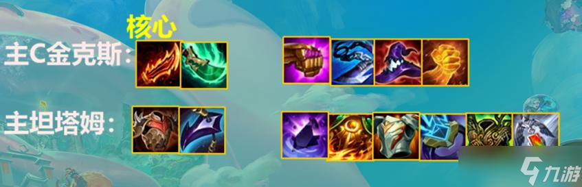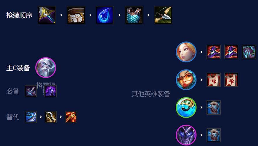 〖One〗、副c琪亚娜:饮血剑/正义之手+暗夜收割者+考验护手/泰坦的果断/无尽之刃。可选副c卡特琳娜:珠光护手+正义之手/海克斯科技之剑+离子火花。可选副c艾克:泰坦的果断+珠光护手+正义之手/大天使之杖。这套阵容更推荐魄罗,由于魄罗全部铭文都能更新出去,带魄罗出双喜临门铭文的几率会更高。