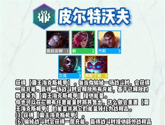 在金铲铲之战S9赛季中,要想获得霸王龙,需要构建3个皮尔特沃夫羁绊。皮尔特沃夫羁绊的独特效果是,可以让你获得名为【霸王海克斯机甲】的特殊单位。每当你的战斗失利时,【霸王海克斯机甲】的充能值就会增加一层。