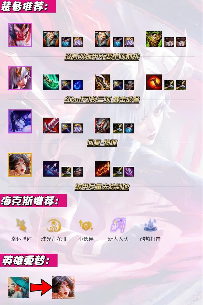 副c琪亚娜:饮血剑/正义之手+暗夜收割者+考验护手/泰坦的果断/无尽之刃。可选副c卡特琳娜:珠光护手+正义之手/海克斯科技之剑+离子火花。可选副c艾克:泰坦的果断+珠光护手+正义之手/大天使之杖。这套阵容更推荐魄罗,由于魄罗全部铭文都能更新出去,带魄罗出双喜临门铭文的几率会更高。
