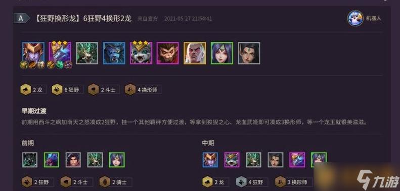 阵容包括:纳尔、杰斯、龙女、蔚、龙王、狼人、猴子、阿狸。阵容组成羁绊:羁绊为4狂野、3斗士、3换型、2龙、2海克斯。英雄装备选取:英雄装备主要选取为龙女-卢安娜的飓风、正义之拳,杰斯-鸟盾、基克先驱,纳尔-防御装,蔚-大天使、正义之拳。