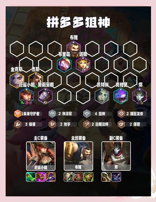 阵容成员:艾希、婕拉、莫甘娜、德莱厄斯、布隆、烬、奥利安娜、希尔科。阵容羁绊:5辛迪加2精密发条2狙神2白魔法师2学者2保镖1微光首脑。阵容海克斯:【首选】:辛迪加之心+白魔法师之心+我为人人。【次选】:狙神之巢+狙神之心+羽量级选手1。
