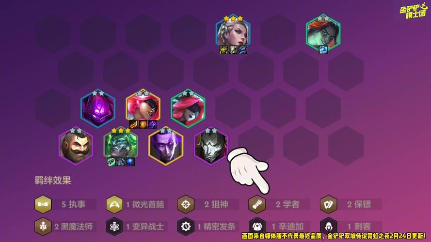 阵容:赛娜,莫甘娜,纳尔,塞勒芬妮,发条,璐璐,希尔科,构建一个4白魔3社交名流1微光首脑的阵容。 海克斯推荐:优先选取双重麻烦2,三费之力2,后排之迅2,以增强队伍的战斗力。
