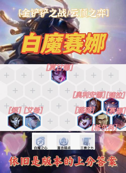 在云顶之弈中,白魔赛娜的阵容是以赛娜为主C,前排为莫甘娜,再加上萨勒芬妮,奥利安娜,烬,纳尔,璐璐七人组成4白魔法师,3社交名流,2精密发条。这样的配置能够确保队伍在战斗中拥有稳定的输出和良好的控制能力。