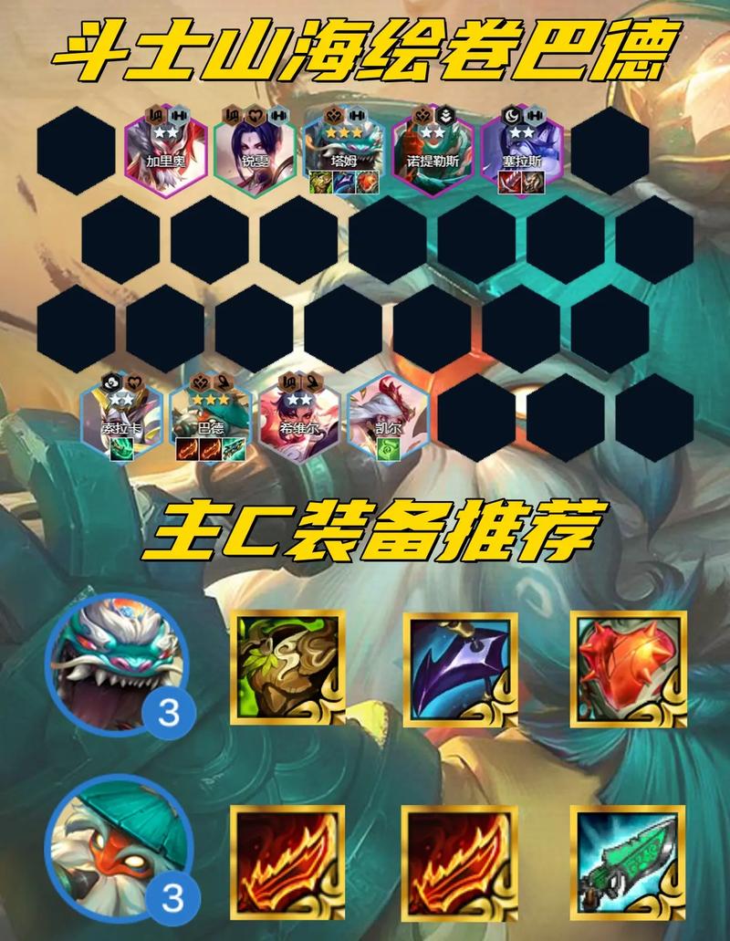 主C龙女:羊刀+水银+夜之锋刃。水银用于免控,夜之锋刃提供高输出,羊刀保证龙女持续输出。主C努努:汲取剑+巨龙之爪/棘刺背心+狂徒铠甲。狂徒铠甲搭配8斗士效果显著,巨龙之爪用于防止被法术秒杀,棘刺背心防止被物理英雄打爆。副C厄加特/稻草人:青龙刀+帽子+法爆/鬼书。