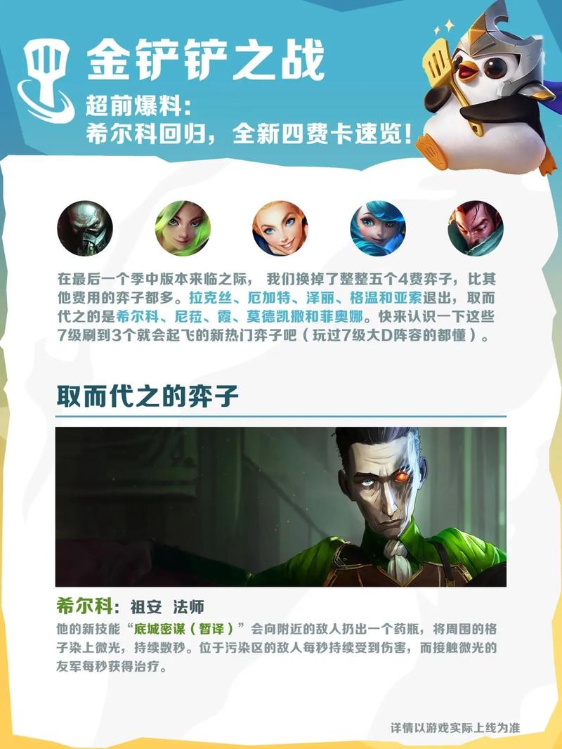 更新时间基本上一致 云顶之弈的更新时间是9月21日,所以金铲铲之战也应该是9月21日正式更新。内容:新羁绊:会上线几个全新的羁绊,并且保留大部分s9版本羁绊与棋子。
