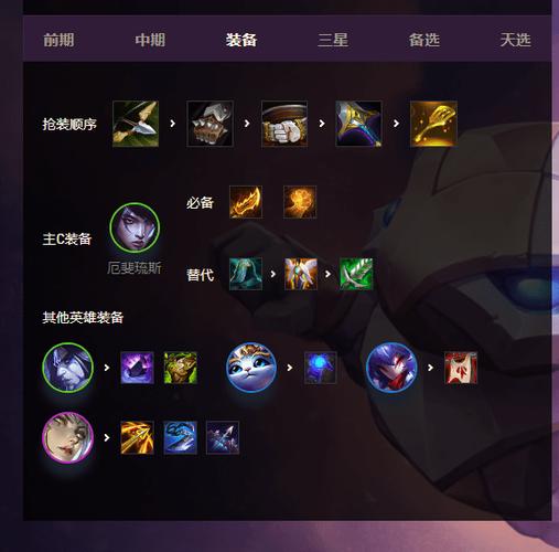 〖Three〗、在金铲铲之战中,对于天选福星装备的分配,需要根据阵容的具体需求来进行。首先,推荐的阵容是奥拉夫、塔姆、诺手、剑魔、瑟庄妮、基兰、卡特、派克和安妮,这样可以形成6福星3猩红之月3战神的羁绊效果。