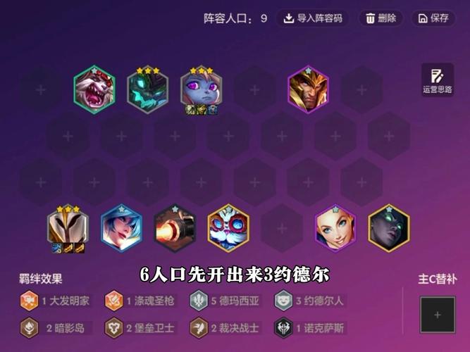 〖Two〗、在前期很强的羁绊有神谕卡尔玛、术士大眼、德玛西亚,推荐玩家使用3虚空2司令2术士来渡过前期,需要的角色有乌鸦、任意3虚空(必须要有大眼)、和提莫,除了这之外用卡尔玛打工也很好用,推荐凑一个3艾欧尼亚和2神谕。
