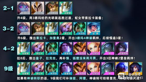 〖Five〗、在装备方面,推荐卡莎使用鬼索的狂暴之刃+电刀,为玛尔扎哈打工。在前期运营阶段,玩家需要通过连胜来过渡。具体操作为2-1拉4人口,2-5拉5人口,开局3皮城,通过连败获取资源。3-2拉6人口,4-1拉7人口,7级大搜,寻找目标牌。