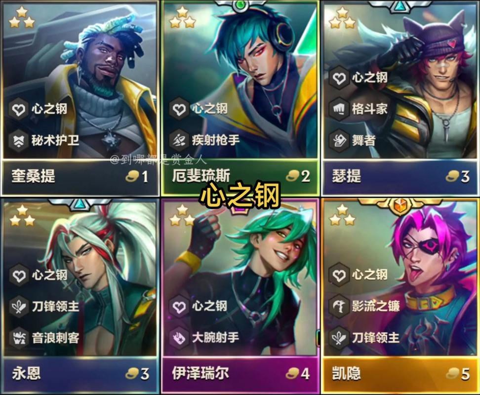 〖Three〗、豪侠、6枪手、1忍者、2海克斯科技、3剑士。『2』阵容搭配:暮光之眼、青钢影、无畏重炮、地火霸主、驱邪圣枪、双枪女帝、暴走萝莉、麦田炮手。『3』装备分配:1)、无畏重炮(主C):火炮、法爆、复活甲。2)、双枪女帝(辅C) :蓝buff、龙刀、天使。3)、暮光之眼(肉盾) :龙砑反甲、狂徒。