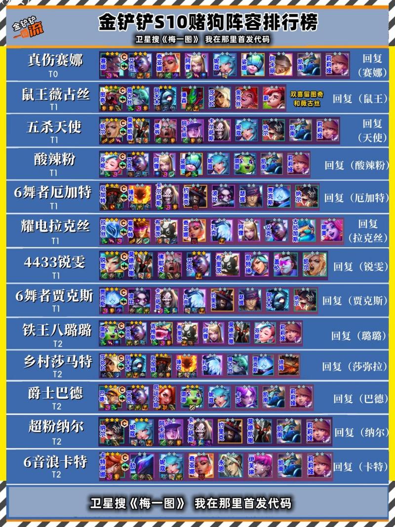〖Five〗、格斗维鲁斯:韦鲁斯、俄洛伊、塞拉斯、奥恩、EZ、赛芬。这套阵容成型速度很快,属于快攻吃烂分卡组。利用快速三星的高质量牌组,在前期就能取得连胜,运营和过渡相对简单,非常适合新手玩家。一打九顶级乌鸦:乌鸦、纳尔、龙女、艾希、瑟提、妮蔻、霞。