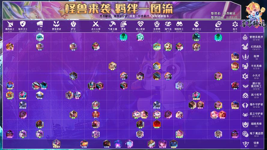 或者直接根据所给的转职纹章来确定后期的阵容。最后一套阵容是由诺姆希、狼人、兰博、龙女、金克斯、慧和乌鸦组成的,这个阵容也可以开出七个羁绊,它们分别是二龙族、二重装、二猎手、三冰霜、二强袭、二换形以及二强袭射手。这套阵容虽然需要三张三费棋子组成,没有前面两个阵容那样好追出七个羁绊。