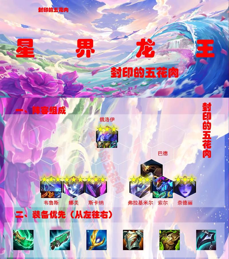 金铲铲之战S7星界龙王阵容近来星界机制是需要上场一回合才能触发各个等级的羁绊效果,龙王需要更早嫖到才有未来,8人口上龙王和9星界打一波后,一波有足够经济能直接D出两星龙王。这需要玩家手速快且头脑清晰。