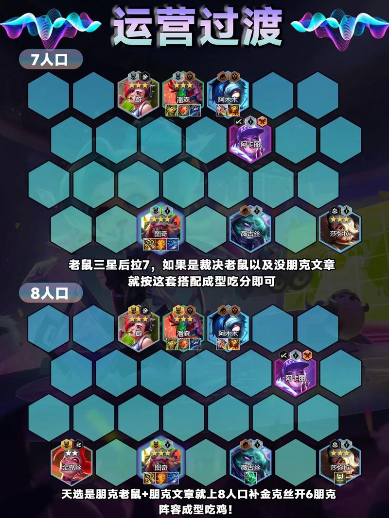 羁绊为4EMO、2护卫、2朋克、2裁决。6人口时,可以上潘森、双老鼠、双阿木木、薇古丝(如果薇古丝数量多可以双薇古丝)。7人口时,上潘森、双老鼠、双薇古丝、双阿木木。8人口时,根据赛季之星来选取搭配。装备分配:主C3星老鼠:推荐装备为红buff/羊刀、轻语、无尽/破防/巨杀。