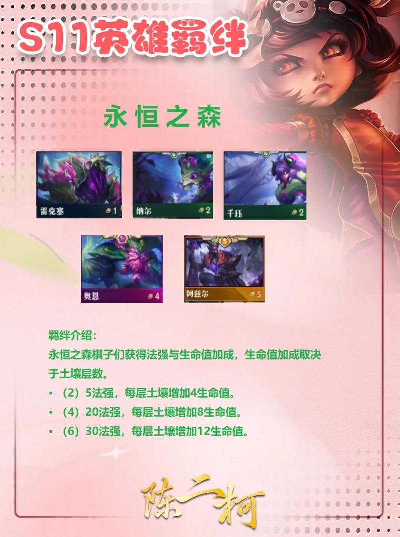 〖Three〗、森林 每过2秒,永恒之森的英雄就会成长,获得额外属性,增加双抗、攻击和法强。1神盾使 战斗开始时,给自己和周围友军增加护盾,这个护盾作用于神盾使时效果增加50%。1神射手 神射手们的攻击和技能会弹射,造成降低过的伤害。1天煞 这是凯隐的独家羁绊,战斗三场后,他会变身。