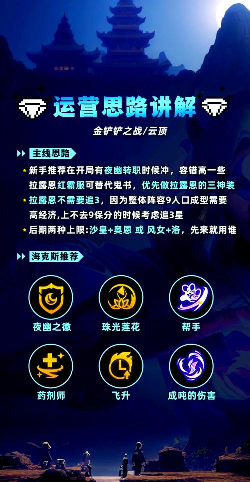 金铲铲之战夜幽神谕阵容推荐阵容介绍夜幽的斩杀机制也是非常强大,但是高夜幽的爽局不是每次都有,常规都是搭配神谕者一起组合,这套在于超多的4费卡,我们可以在8级有不错的战斗力,后面上9也可以有不错的提升。