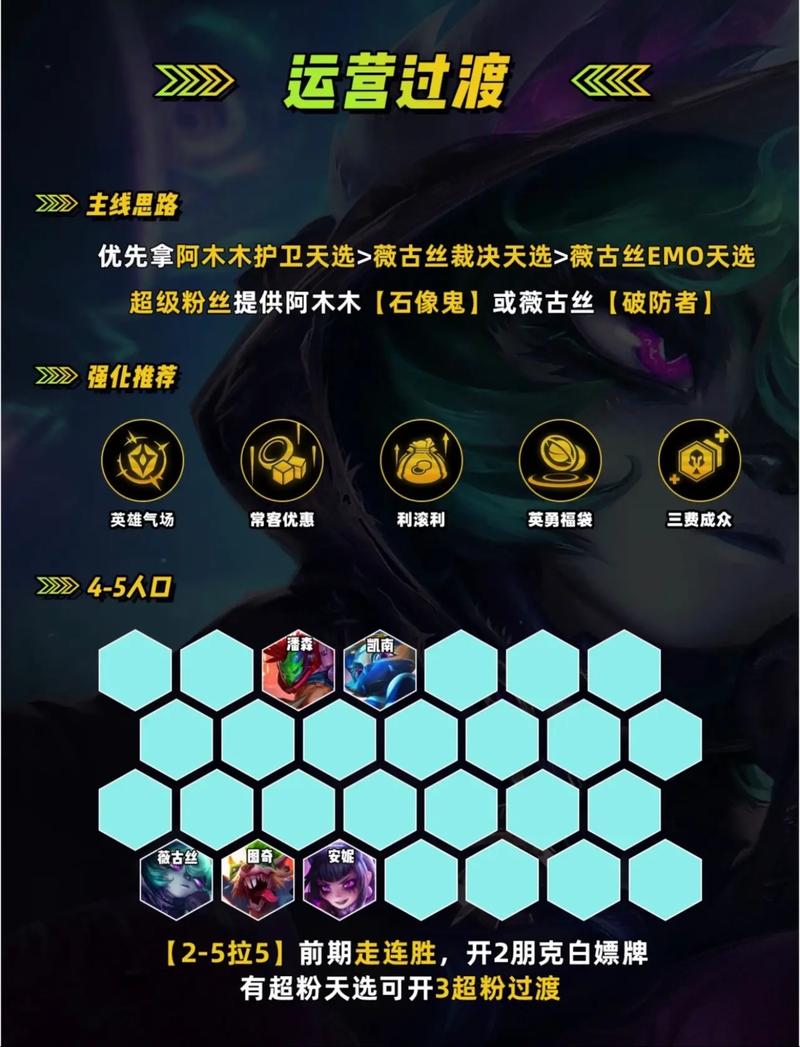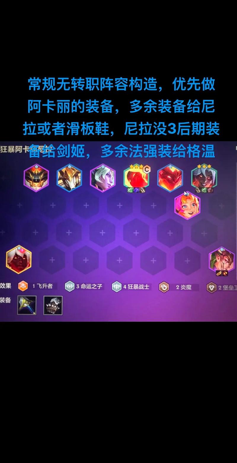 ①弓开局的话尽量走连胜,装备不需要抢的情况下。②开局可以三国豹女带装备,也可以看天选走。③中期尽量拿体系卡不搜卡,上7-8人口根据血量拉质量。④搜卡之前一定要先卖天选,8人口有可能拿到天使天选。忍刺阿卡丽 阵容组成:永恩、皎月、肾、阿卡丽、劫、凯南、派克、男刀、卡特。