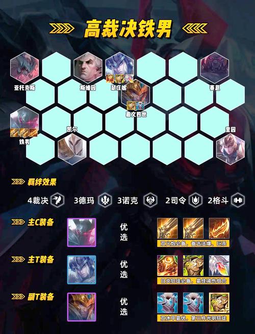 阵容组成 德莱厄斯:核心输出,装备推荐正义之手、暗夜收割者(或再一件正义之手,以增强持续作战能力)。霞:副C,装备推荐锐利之刃、巨人捕手、最后的轻语,提升物理输出和穿透能力。瑟庄妮:前排坦克,装备推荐薄暮法袍、石像鬼石板甲、狂徒铠甲,增强生存和抗性。